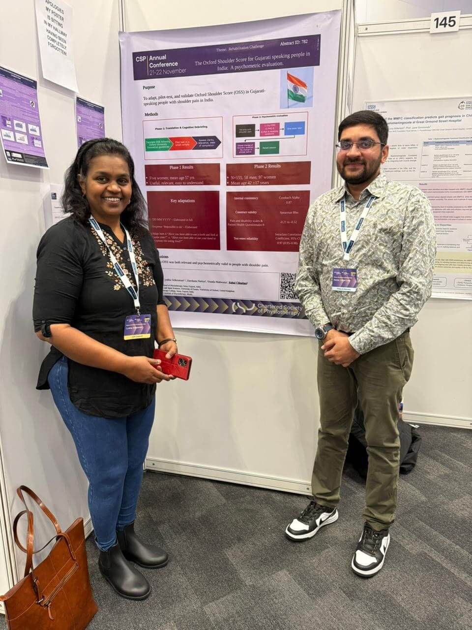 Dr. Hari Babu and Dr. Vrunda Makwana were part of the research study titled “The Oxford Shoulder Score for Gujarati-speaking People in India: A Psychometric Evaluation,” conducted in collaboration with Dr. Cynthia Srikesavan, Senior Researcher, University of Oxford (UK). The PPSU research team has been actively working on this project for the past two years. The study has been accepted for E-Poster presentation at the International CSP Annual Conference, to be held in Wales, United Kingdom, in November 2025. This achievement reflects the institution’s commitment to high-quality research, international collaboration, and scholarly contribution in the field of physiotherapy.
