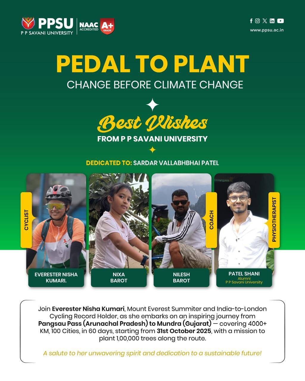 The P P Savani School of Physiotherapy proudly shares that its alumna, Dr. Patel Shani Sureshbhai, has been appointed as the personal Physiotherapist to Everester Nisha, a Mount Everest summiter and India-to-London cycling record holder. Dr. Shani will be supporting her during the inspiring environmental mission titled “PEDAL TO PLANT – Change Before Climate Change.”